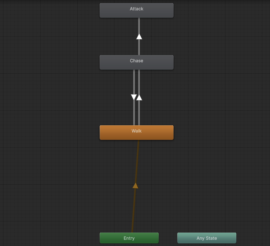 The enemy agent has three different states: walk, chase, and attack. Each of these states has an animation associated with them. The agent begins to chase when the player sees the agent. If the player gets too close to the agent, then the agent transitions to attack. The attack state does not transition into any state since once it attacks the game is over.